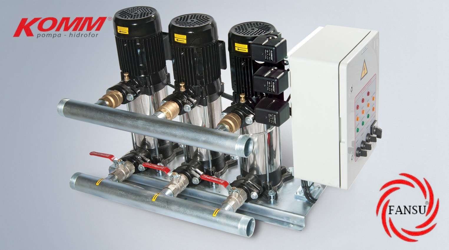 Üç pompalı paket hidroforlar ortak bir kaide üzerine montajı yapılan her pompanın emme hattında vana basma hattında çekvalf, basınç şalteri, manometre bulunan hidroforlardır. Hidroforlarda kullanılan elektrik kumanda panosunda faz hatası, faz sırası kontrolü ve susuz çalışmaya karşı 5 m seviye flatörü standarttır. Hidrofor panolarında sıra değiştirme, rotasyon özelliği bulunmaktadır.